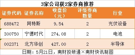 从券商推荐家数来看,5月21日有66家上市公司得到券商推荐,其中阿特斯获得2家推荐,宁德时代获得2家推荐,北方华创获得2家推荐。