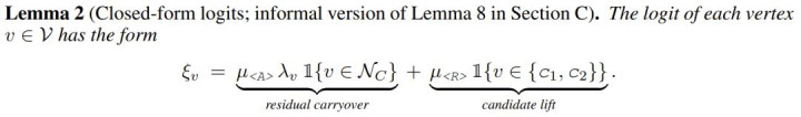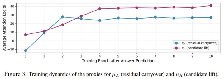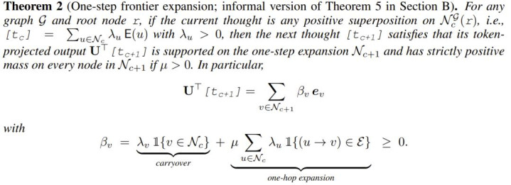 残差信号(residual carryover),它将最后一个思维 [t_C] 中已探索的节点以强度 μ_A 传递至答案 tokenA。具体来说,这对应于第一层从A到 [t_C] 的注意力,用于复制可达节点的叠加状态。