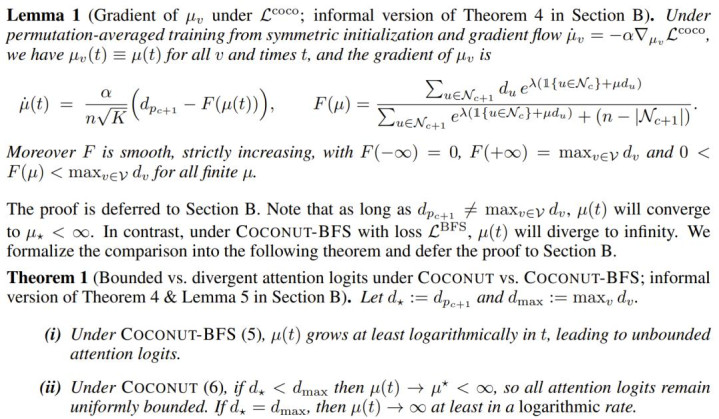 他们的理论分析与实验结果均表明,当采用连续思维训练(Coconut 方法)时,索引匹配 logit(index-matching logit)(衡量模型局部搜索能力强度的一个关键指标)在温和假设下保持有界(bounded)。这与传统 Transformer 分析截然不同 —— 后者在无连续思维的情况下,logit 会呈对数增长并趋于无界。