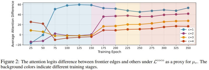 在阶段 1(蓝色背景)中,模型在预测第一个连续思维(c=1)时,逐步学会了关注前沿边。logit 差值稳步上升,并在约 125 个 epoch 后稳定于 60 附近,与定理 1 的理论预测一致:在 L^coco 下,μ_v 先增长后趋于稳定且有界。